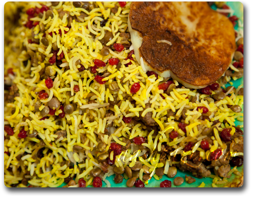 2 Cups Rice 1 Cup Lentils 1/2 lb (226g) Ground Beef 1/2 Cup Raisins 1 Tsp Zafran (Saffron) Salt, Black Pepper Powder, Ground Cinnamon 1 Small Onion 7 tbsp Vegetable Oil 1 Medium Potato 3 oz (85g) Dried Barberries (Zereshk) PREPARATIONS: 1- Soak the rice with 1 Tsp salt for 1 hour in a pot. 2- Add 1 Tsp Zafran (saffron) to 1/4 cup boiling water. 3- Dice the onion 4- Slice the potato 5- 6 cups boiling water DIRECTIONS: 1- Put the Lentils in a small pot, add salt and pour in boiling water until it covers the lentils (Approx. 2 cups of boiling water). 2- Cover the pot with the lid (leave the lid cracked open so the steam can scape) and simmer for 30 minutes at low heat. 3- Pour the soaked rice (including the water) into a pot and simmer the rice until it becomes tender. 4- Drain the rice in a colander. 5- In a small pot, dip fry the diced onions in vegetable oil until translucent. 6- Add the ground beef to the pot. 7- Add salt, black pepper powder and ground cinnamon, stir well and fry along until the beef is evenly brown. 8- Add the raisins to the pot and continue frying for 5 minutes. 9- Pour in the lentils in the rice pot and mix well so the lentils and rice are well blended. (Optional: you can keep 1/3 of the lentils back to mix with the beef mixture). 10- In a large pot, pour 2 Tbsp vegetable oil, lay the sliced potatoes across the pot and add the lentils and rice mixture to the pot. Add 2 tbsp oil (Mix 2 Tbsp Oil with 4 Tbsp boiling water) to the pot. 11- Cover the pot with a large napkin and put the lid on top. 12- Cook for 20 to 25 minutes. 13- Add 5 to 6 tbsp of the lentils rice to the beef/raisins mixture, then pour in the soaked saffron (Optional: Add the 1/3 of the lentils to the pot, if kept from the prior step (step 9). 14- Mix thoroughly, cover the pot with the lid and cook for 15 minutes. 15- Fry the dried barberries in 1 tbsp vegetable oil. 16- Add the beef/raisins mixture to the lentil rice pot, stir thoroughly until well mixed. 17- Add the fried barberries right before serving.